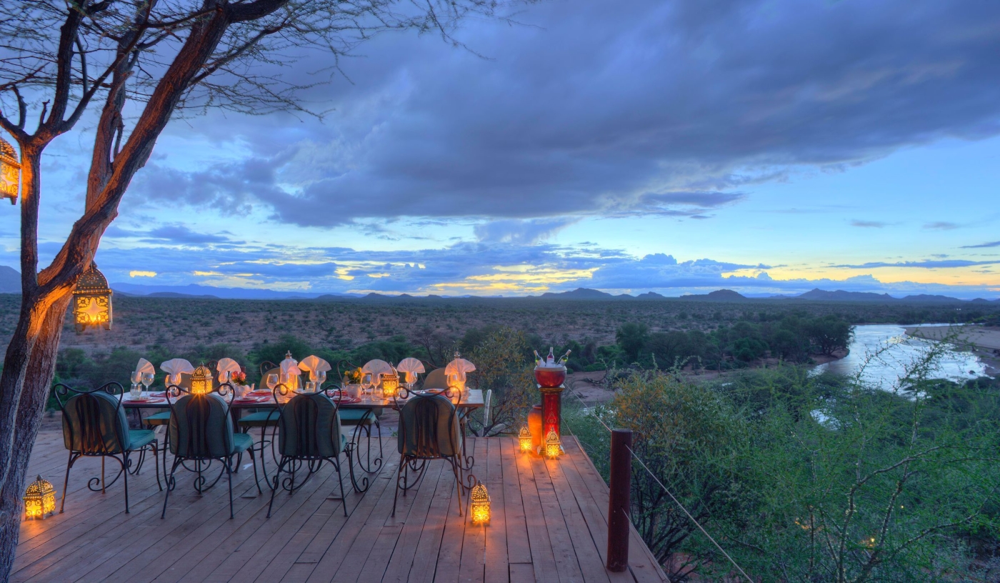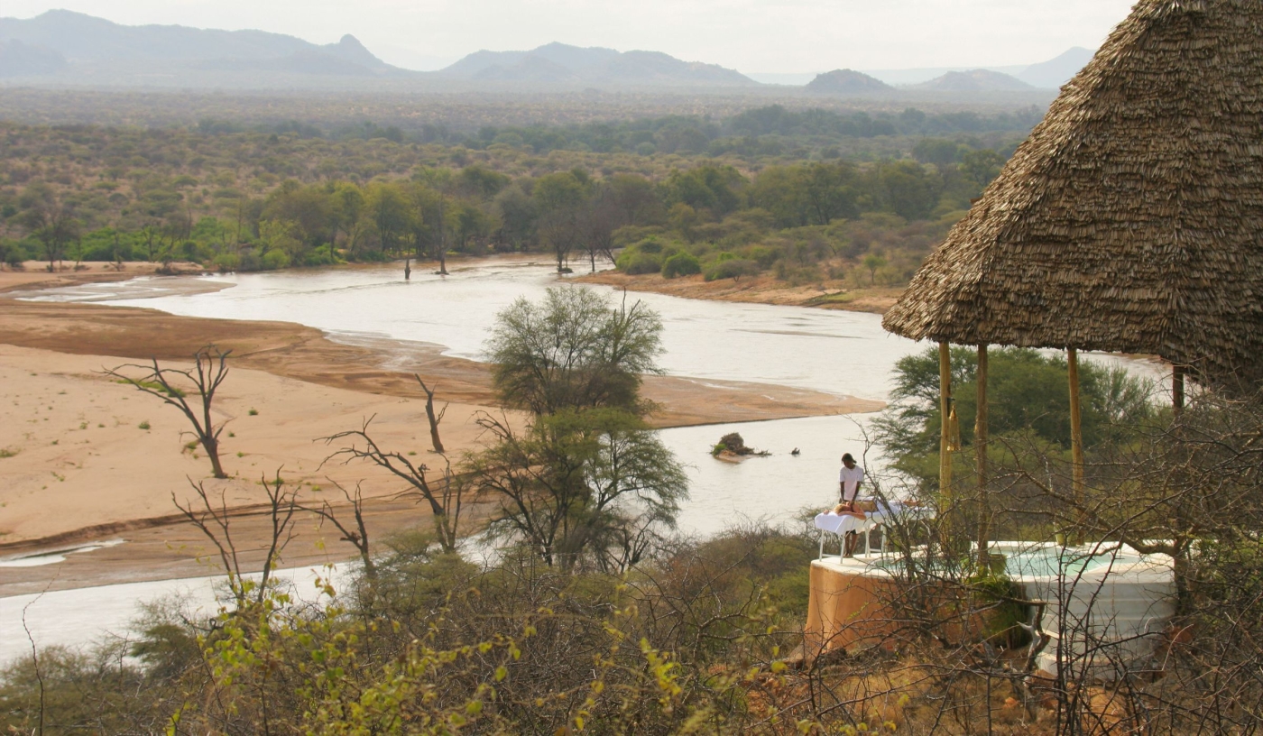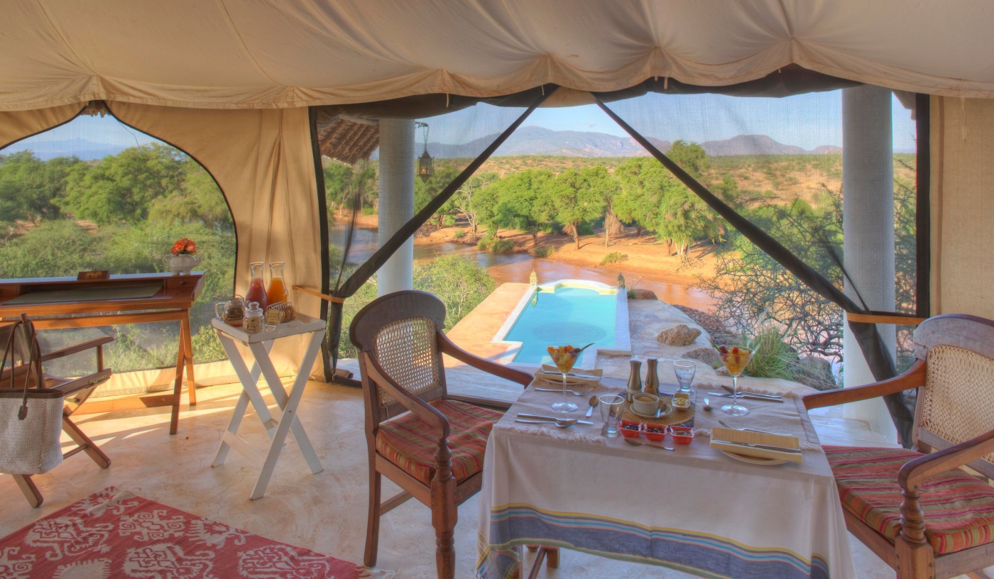 A luxury tented camp perched on the edge of a river valley with breathtaking views across the Laikipia Plateau towards the jagged peaks of Mount Kenya.
