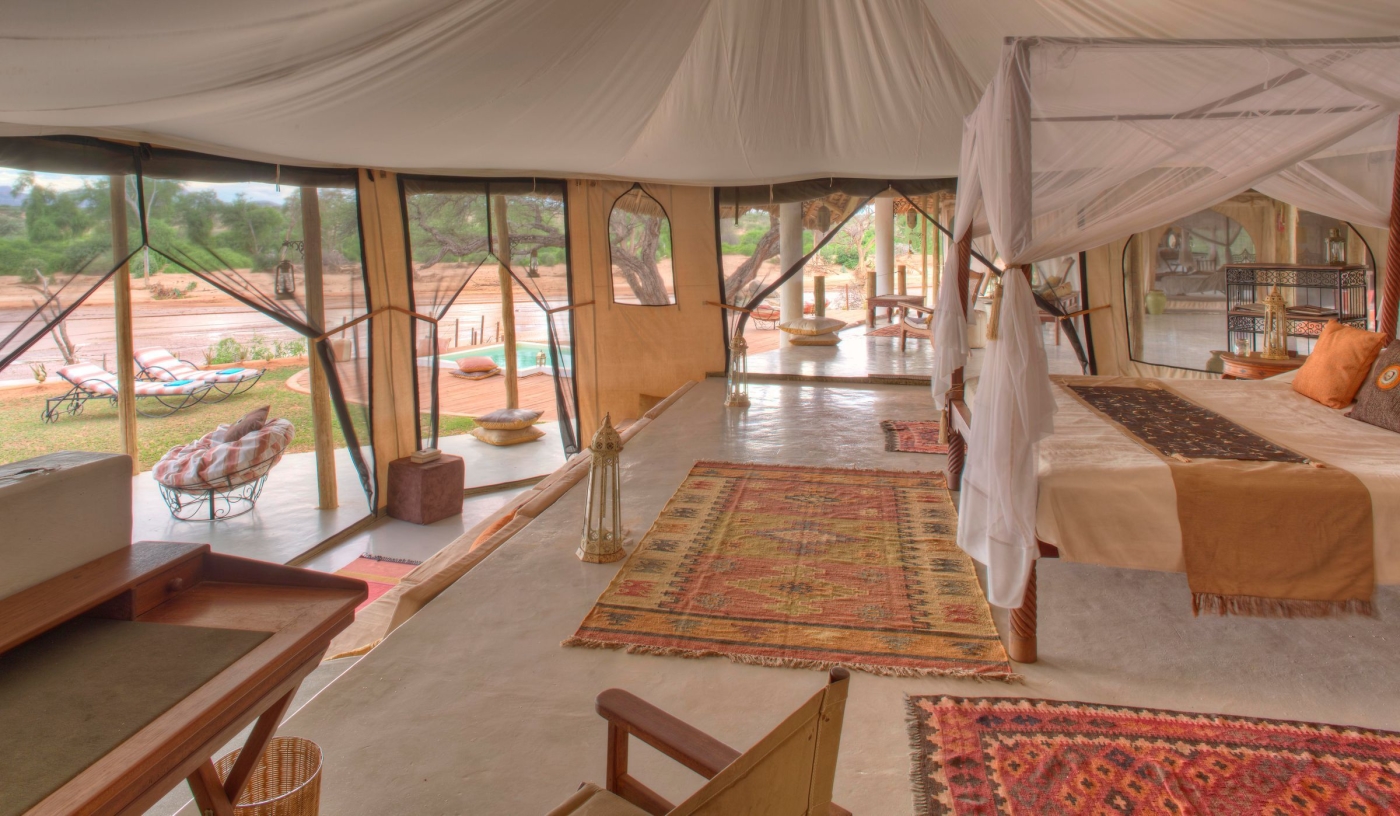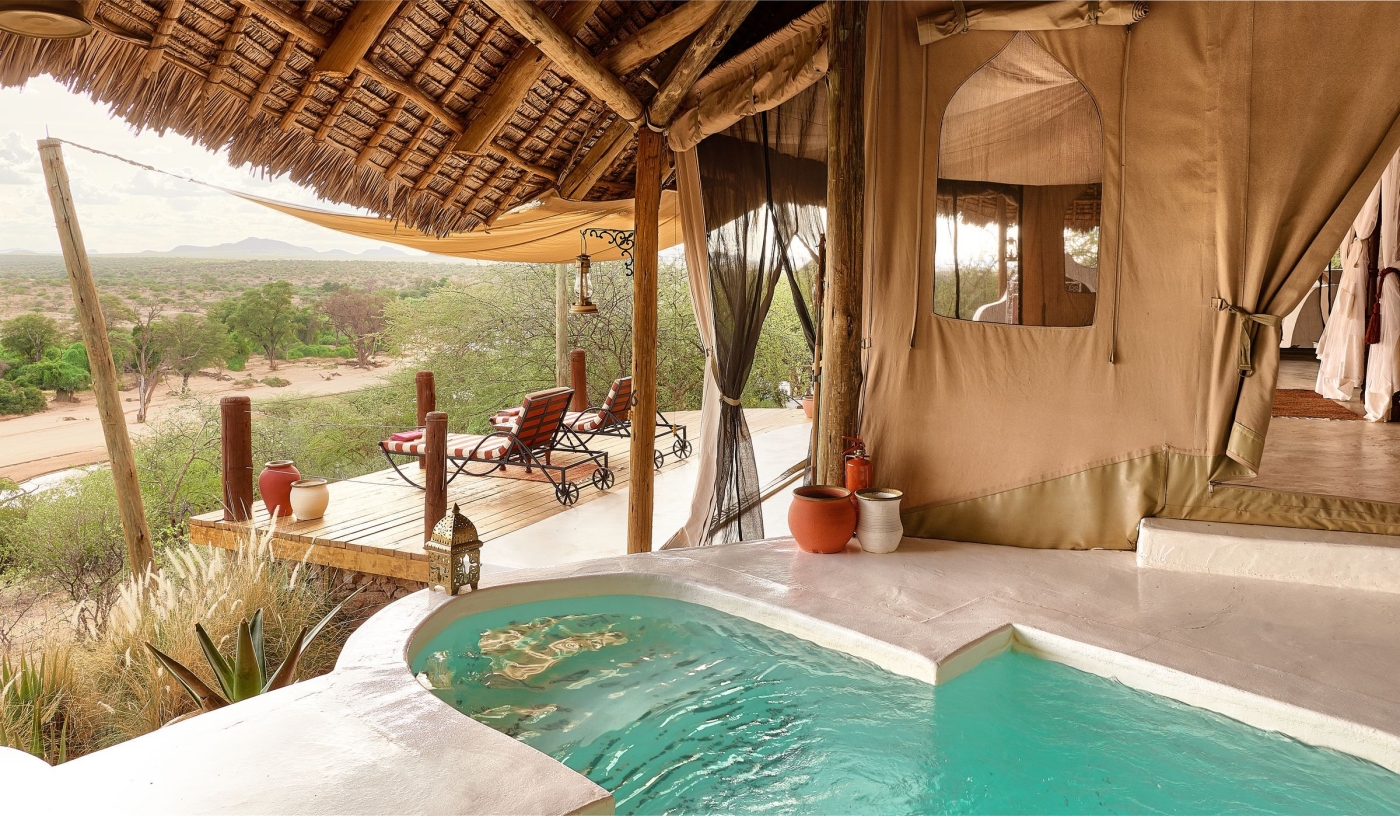Both Moroccan and Swahili influences can be seen in the nine open-fronted thatch-and-canvas tents of Sasaab. At over 100 square metres, each tent is incredibly spacious and features a four-poster bed, enormous open-air bathroom and a private veranda with a plunge pool and sun loungers. Two of the tents have been combined to form a vast family suite that can be booked as an exclusive villa, with a shared central area and separate access, making it a great choice for those seeking even more space and privacy.